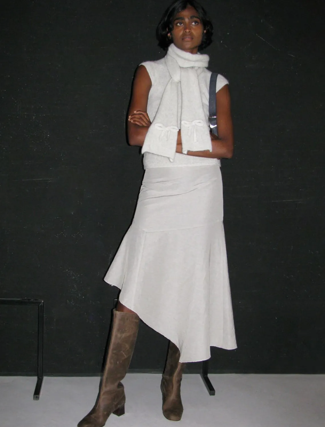 Blødt Strik Tørklæde Med Syede Sløjfedetaljer I Begge Ender.Farve Lysegrå.Made In Spain.